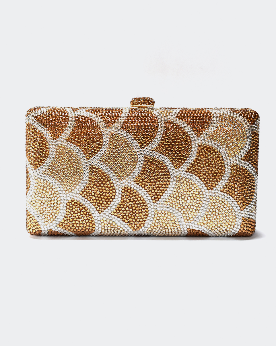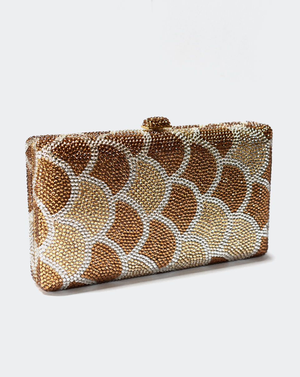 Clutch in Metall mit silber- und goldfarbigen Kristallen.