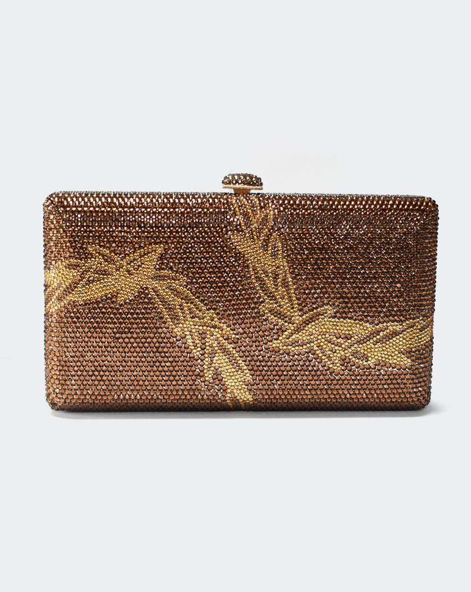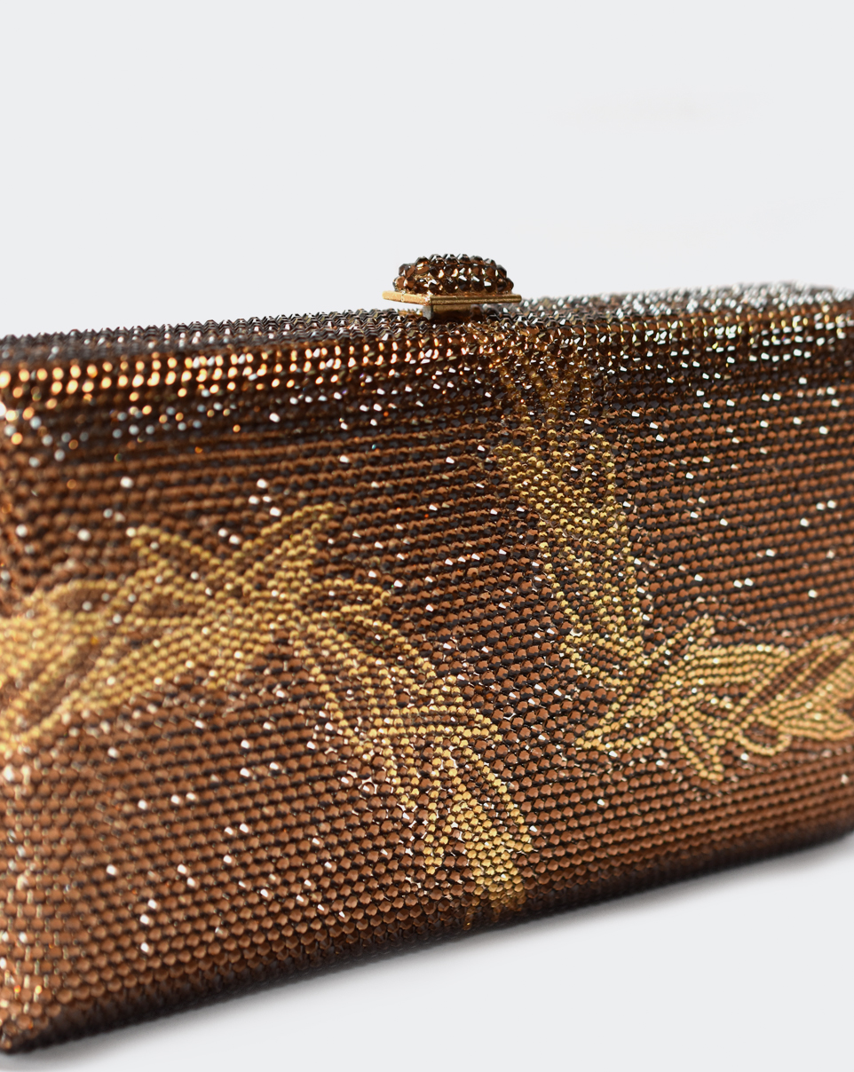Clutch in Metall mit goldfarbigen und braunen Kristallen.
