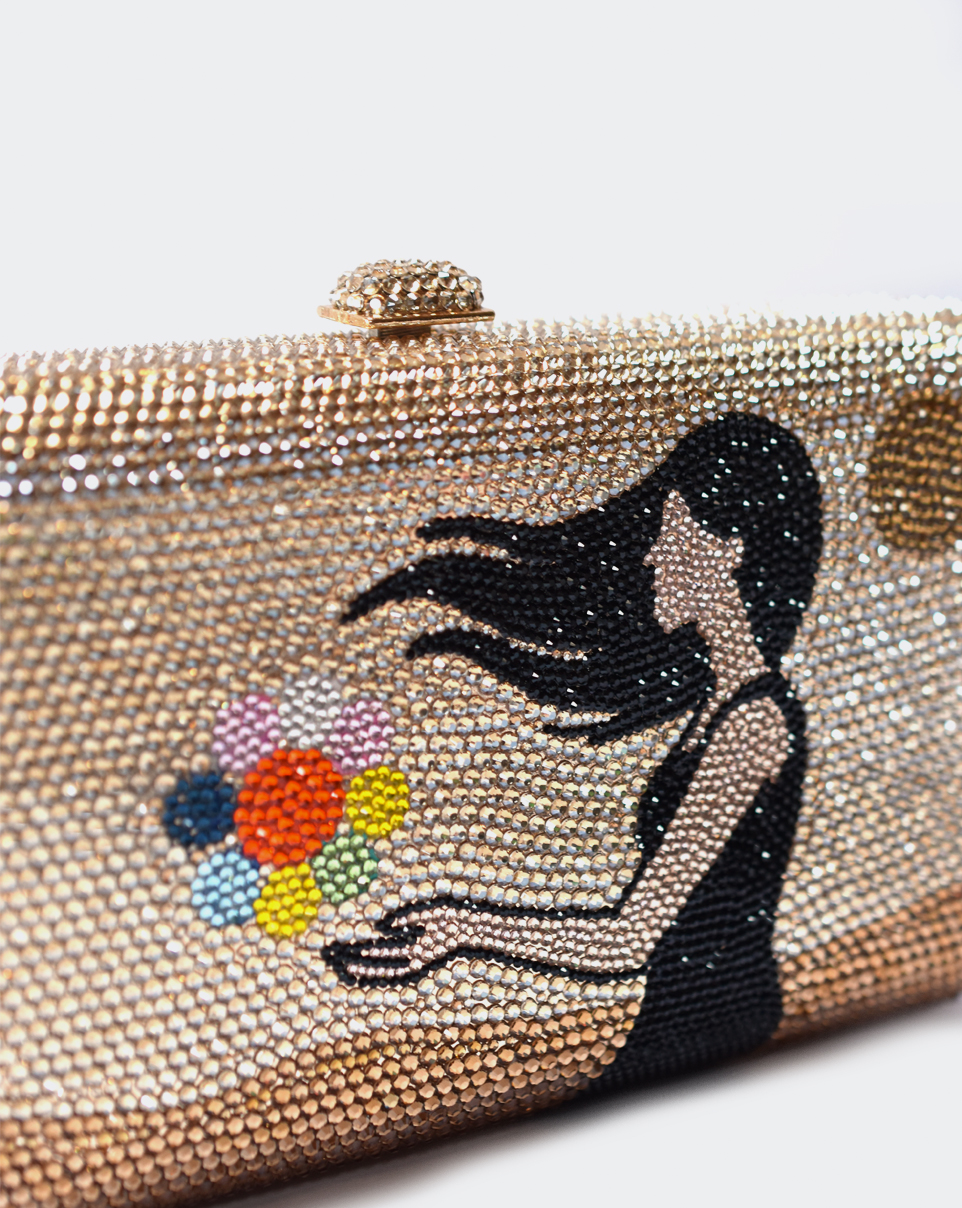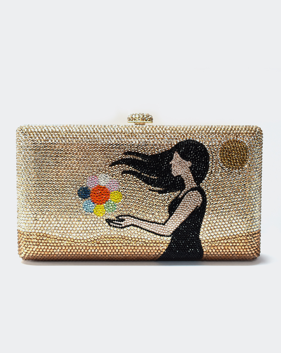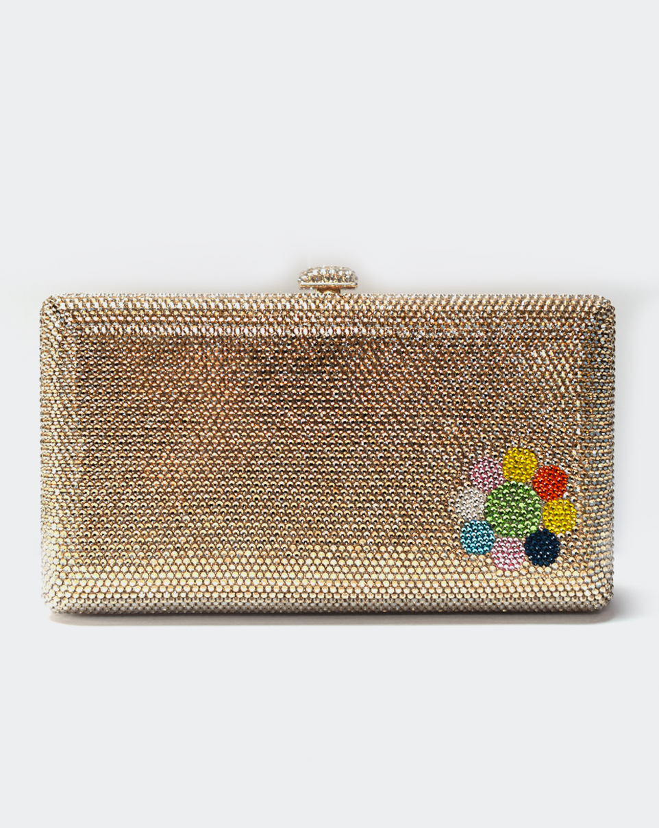 Clutch in Metall mit mehrfarbigen Kristallen.