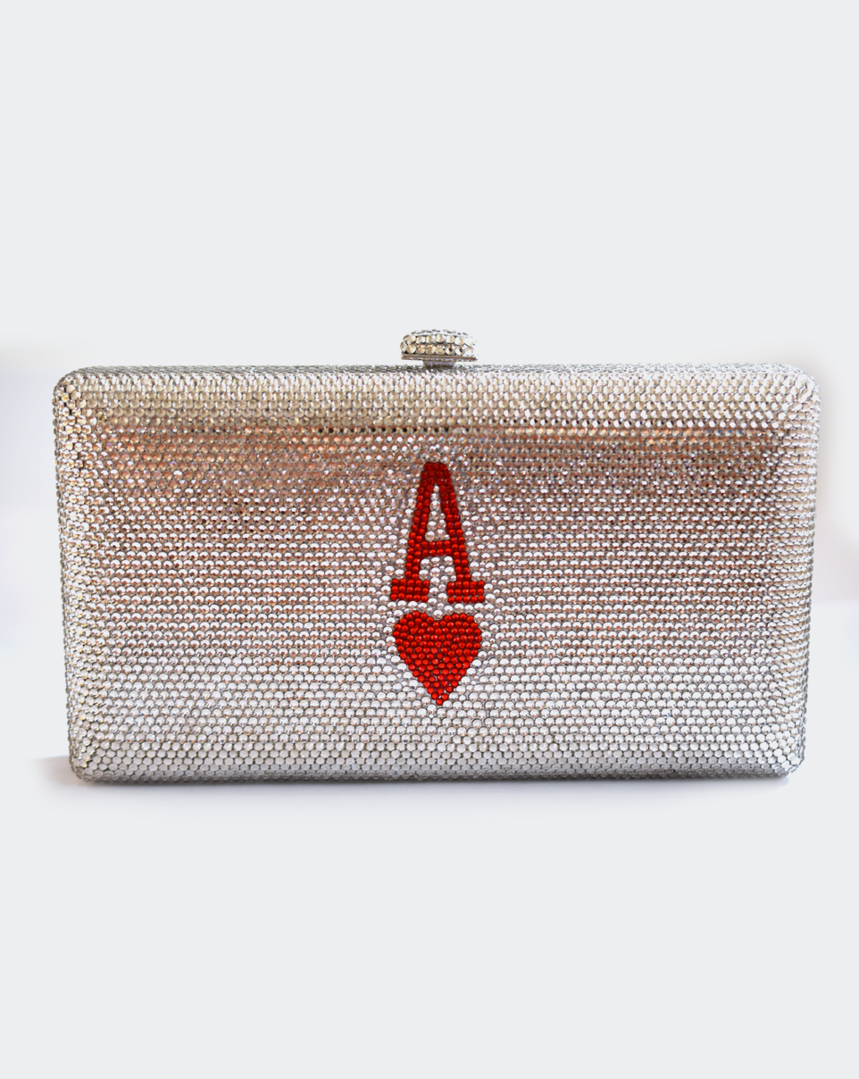 Clutch in Metall mit silberfarbigen, roten und schwarzen Kristallen.