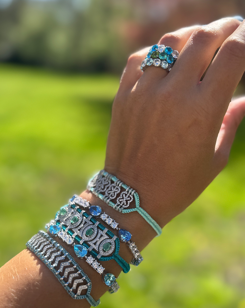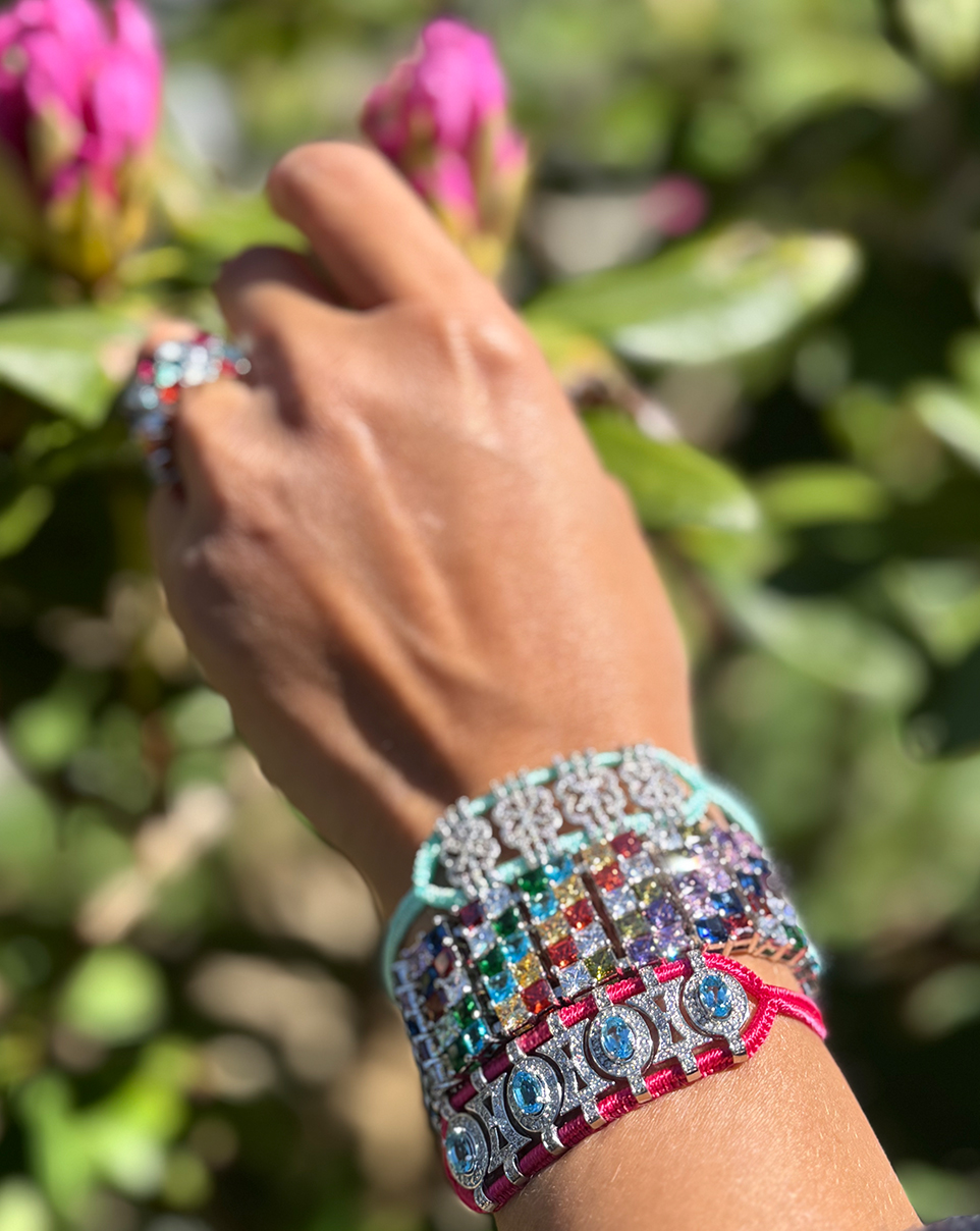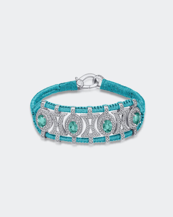 Armband in Sterling Silber mit 235 Pavé-Mossanitesteinen, ovalen Mossanitesteinen und mehrfarbigen geflochtenen Fäden aus Baumwoll-Polyester.